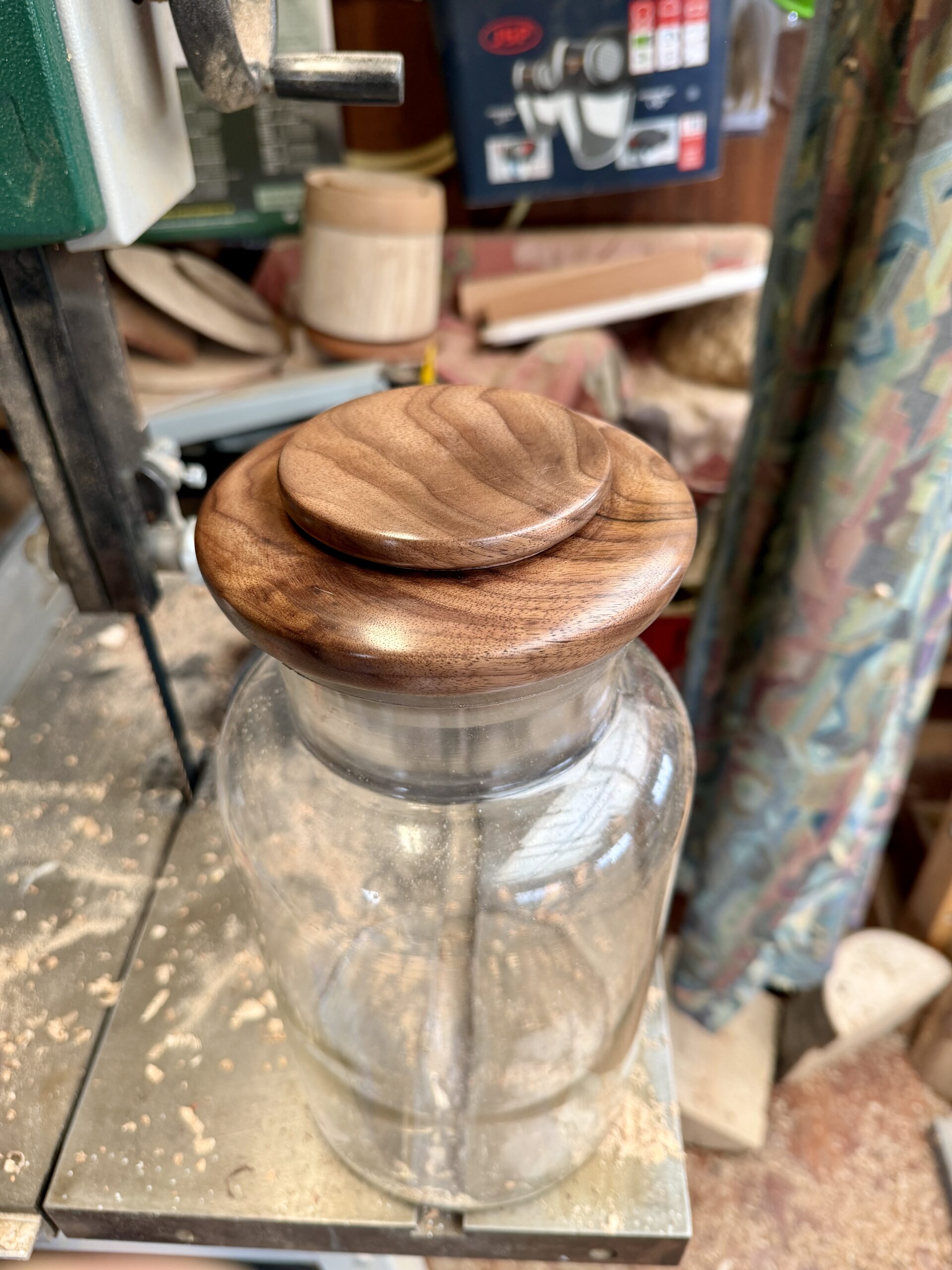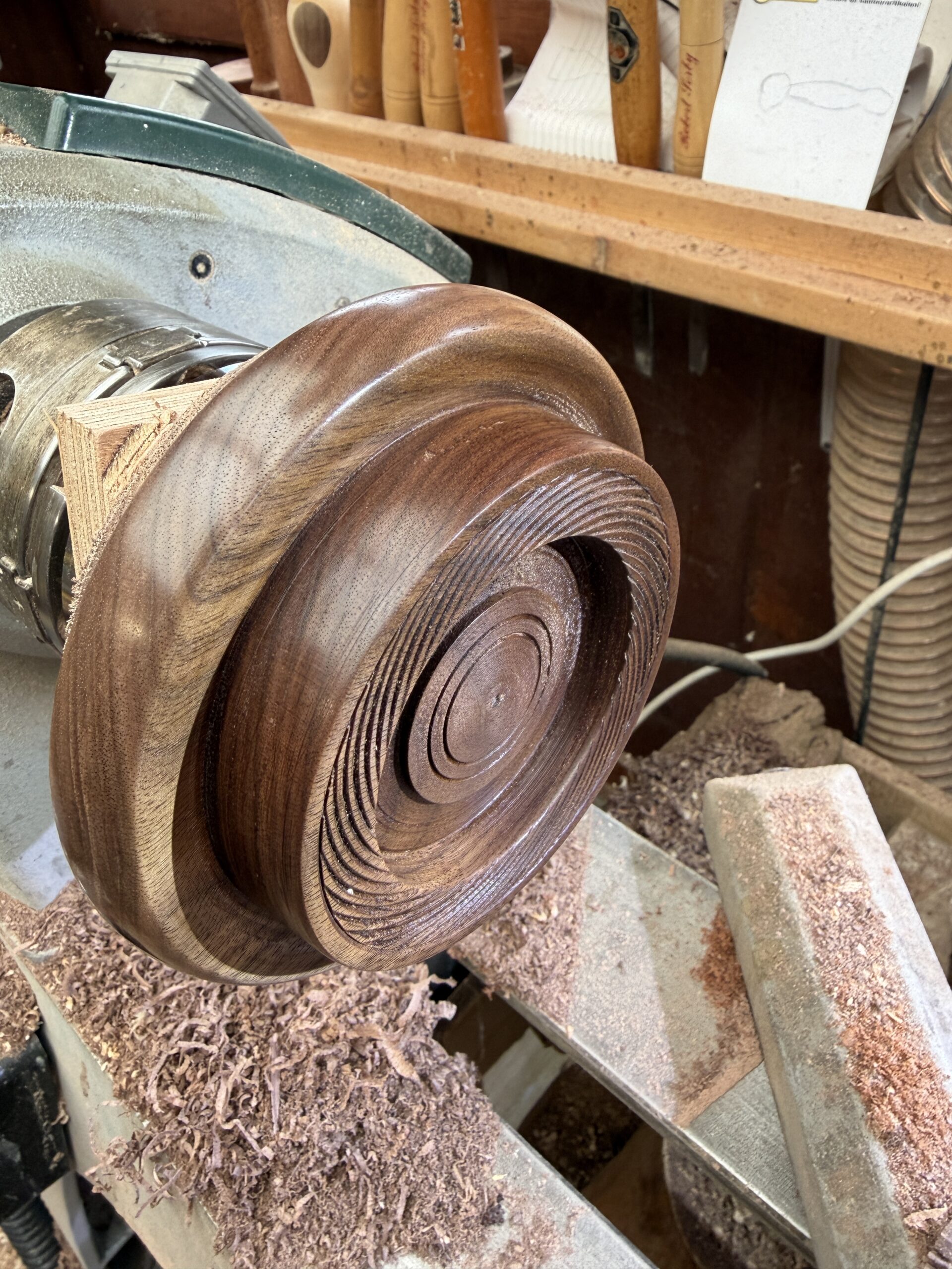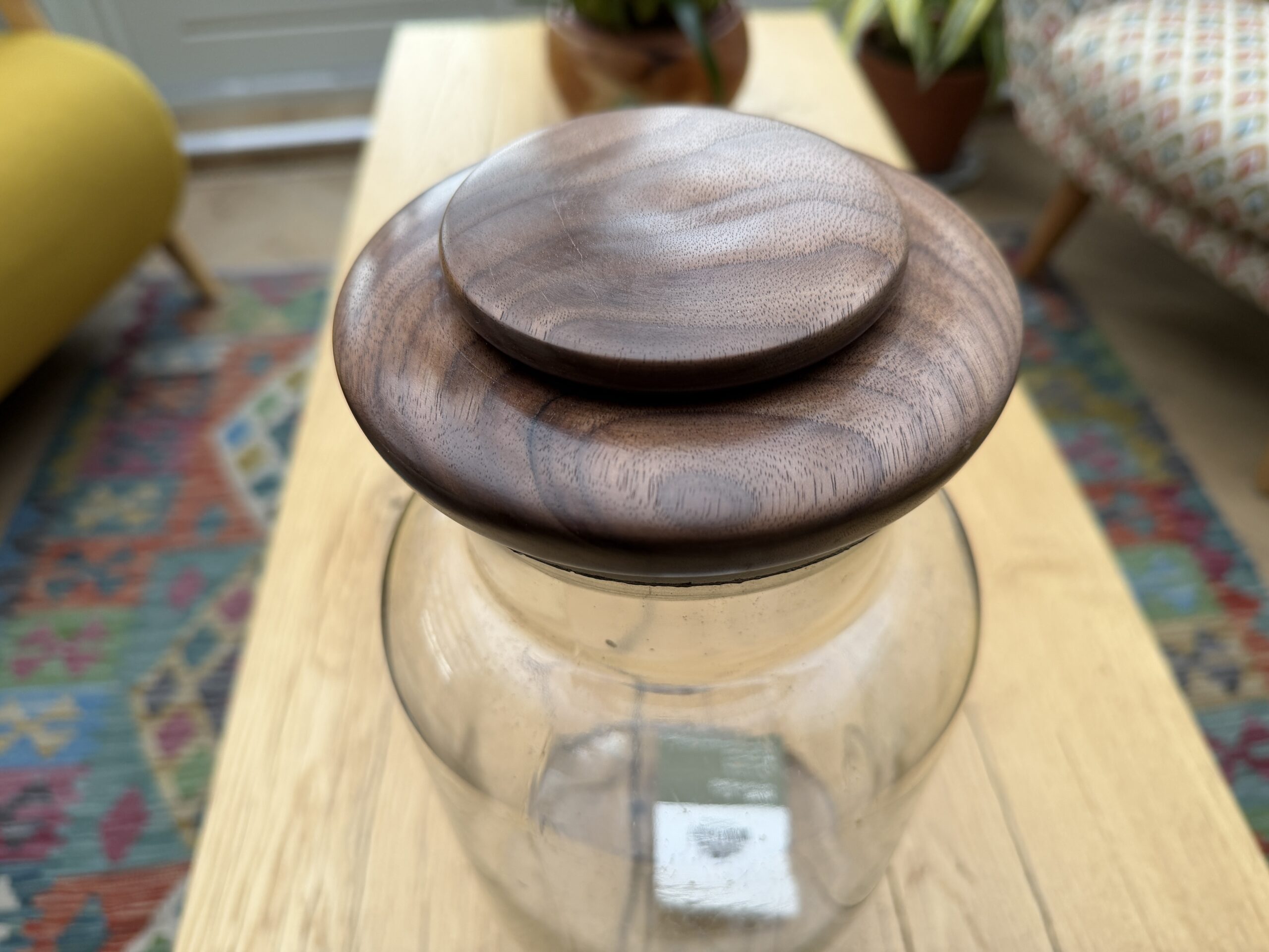 Via via vroeg iemand of ik spurtles kon maken. Ik wist niet wat dat waren maar het schijnen roerstokken te zijn die met name in Schotland worden gebruikt om havermout of yoghurt te roeren. IK heb er 2 gemaakt en ik direct vraag om deksel voor een grote pot toemaken (oude was kapot gevallen). In de vaas worden walnoten gebruikt dus ik heb deksel van notenhout gemaakt.